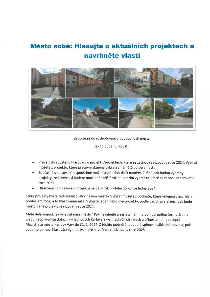 Které projekty byste rádi zrealizovali v našem městě? Vybírat můžete z podnětů, které veřejnost navrhla v předešlém roce, a to hlasováním níže. Vyberte jeden nebo dva projekty, podle vašich preferencí pak bude město dané projekty realizovat v roce 2024. Máte další nápad, jak vylepšit naše město? Pak neváhejte a zašlete nám ho pomocí online formuláře na webu nebo vyplňte dotazník v lednových Karlovarských radničních listech a přineste ho na recepci Magistrátu města Karlovy Vary do 31. 1. 2024. Z těchto podnětů, budou-li splňovat základní pravidla, pak budeme pomocí hlasování vybírat ty, které se začnou realizovat v roce 2025.