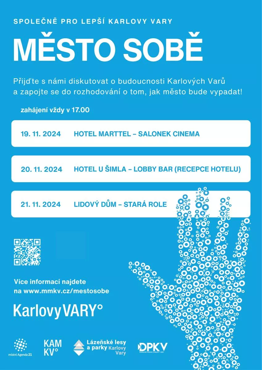 Diskusní fóra pro vás uspořádáme ve třech dnech na třech různých místech ve městě v průběhu listopadu. Místo a termín si můžete vybrat podle svých priorit a časových možností. Přijďte se zeptat, podělte se s námi o svůj názor nebo námět. Zveme vás k dialogu o aktivitách a plánech pro veřejný prostor Karlových Varů. Diskutovat můžete s představiteli města i zástupci městských organizací. Těšíme se na setkání s vámi, protože váš názor nás zajímá.