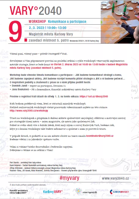 dovolujeme si Vám připomenout pozvání na poslední setkání z cyklu workshopů věnovaných implementaci městské strategie, které se bude konat ve čtvrtek 2. března 2023 od 10:00 do 13:00 hodin v budově Magistrátu města Karlovy Vary (zasedací místnost 5. patro).