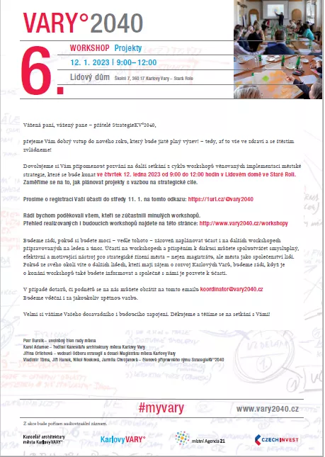 Pokud ze svého okolí víte o dalších lidech, kteří mají zájem o rozvoj Karlových Varů, budeme rádi, když je o konání workshopů také budete informovat a společně s námi je pozvete k účasti.