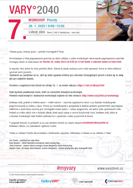 Pokud ze svého okolí víte o dalších lidech, kteří mají zájem o rozvoj Karlových Varů, budeme rádi, když je o konání workshopů také budete informovat a společně s námi je pozvete k účasti.